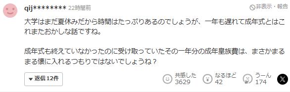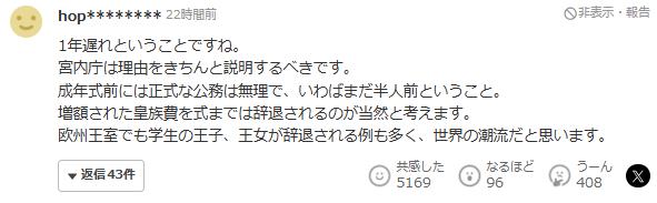 。有日本网友直言:"成人礼都没有举办,莫非要把 1 年的成年皇族费都放进自己口袋?"