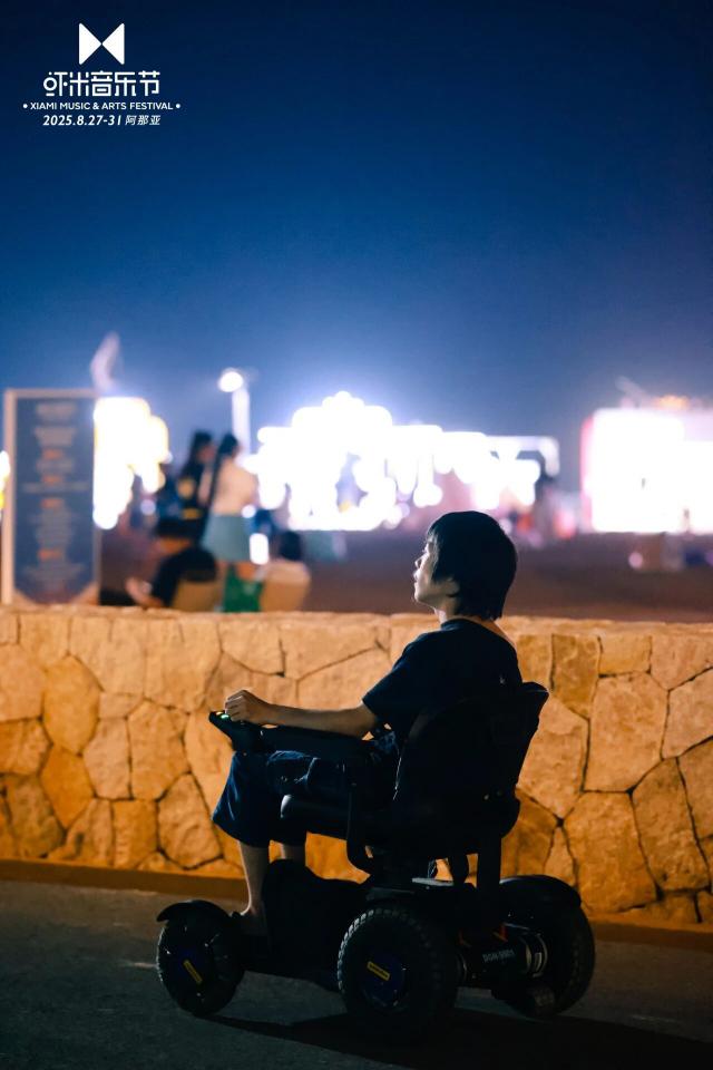 为了及时赶上这场表演,董宇正摇着轮椅从沙滩一侧的舞台飞驰向另一侧。他左手驱动轮椅,右手指向路面,他说"这是我走过最好走的音乐节转场道路。"